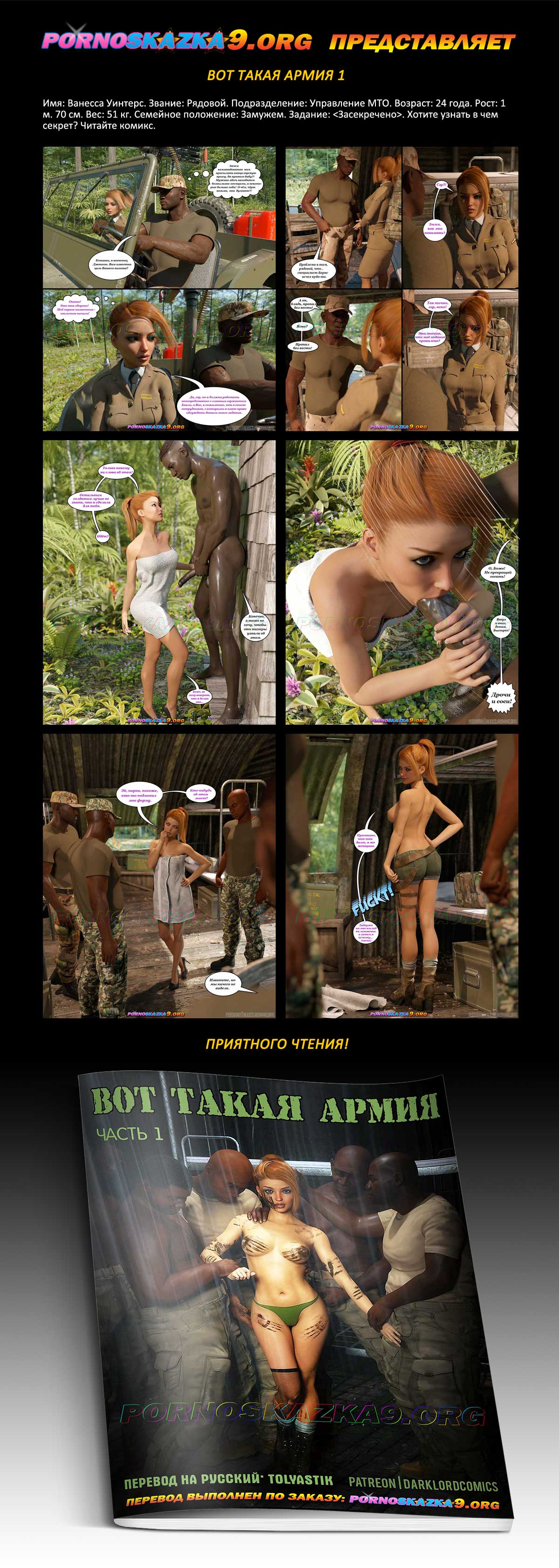 Порно комикс «Вот такая армия. Часть 1.» Имя: Ванесса Уинтерс. Звание: Рядовой. Подразделение: Управление МТО. Возраст: 24 года. Рост: 1 м. 70 см. Вес: 51 кг. Семейное положение: Замужем. Задание: <Засекречено>. Хотите узнать в чем секрет? Читайте комикс.
